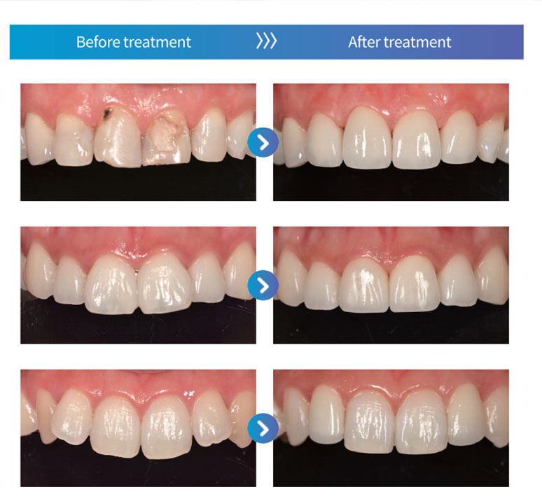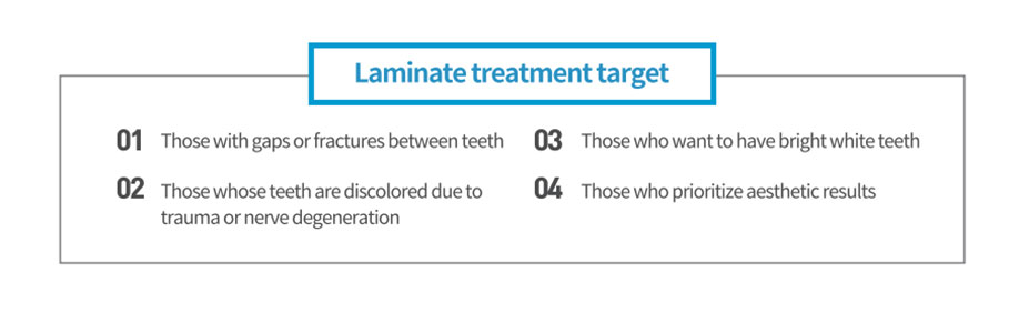 Especially those people who have 'open front teeth' or 'gap front teeth' case is the most concern about laminate. In this case, you can think about laminate, crown, and resin treatment. In the case of crown, tooth preparation is unavoidable, and resin has advantages and disadvantages in the strength and durability are weak compare to crowns and laminates (ceramic), and there is a limited to perfectly realizing the color and shape of the tooth.